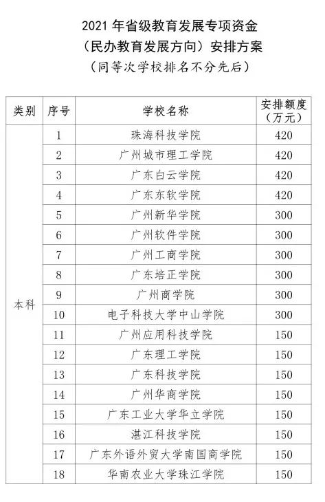 其中,本科高校珠海科技学院、广州城市理工学院、广东白云学院、广东东软学院,以及高职院校广东文理职业学院、广州华立科技职业学院、广东南方职业学院、广州华夏职业学院,8所学校分别收到420万元“大红包”。