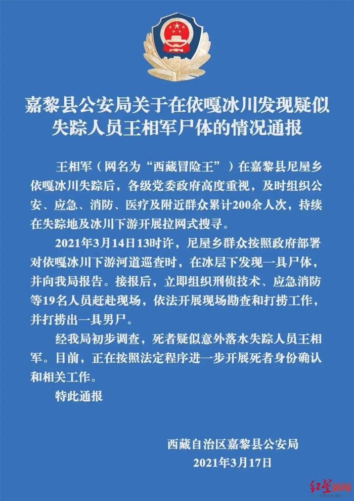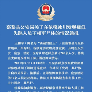 3月18日,嘉黎县公安局发布关于在依嘎冰川发现疑似失踪人员王相军尸体的情况通报,全文如下: