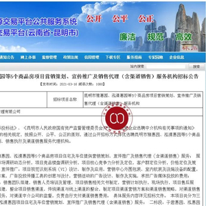 公告显示将通过公开招标方式择优选聘昆明市雅惠园、泓清惠园等5个商品房项目的营销策划、广告策划、销售执行及渠道销售服务代理机构。