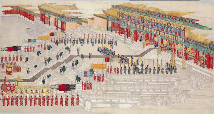 太和殿,紫禁城内最恢弘、等级最高、体量最大的建筑,也是中国现存最大的木结构宫殿建筑。在这座象征九五至尊的宫殿里,举办过明清两朝最为重要的大典。在清代,每逢皇帝登基、大婚、生日,或是在冬至、元旦这样的重大节日,都要在太和殿举行朝贺。在这样的朝贺中,从内阁、鸿胪寺、亲王开始,再依正一品至从九品的次序,朝拜官员从太和殿内一路排到太和门。现藏于故宫博物院的《光绪大婚图》之《光绪帝亲临太和殿命使奉迎》,就细致地描绘了大婚当天的光绪帝在太和殿阅视金册金宝、等候皇后的场景。