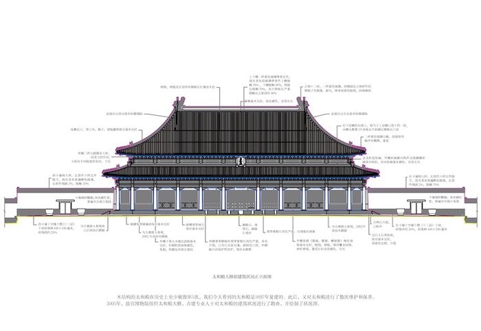 “并不存在会不会倒塌的问题,这需要通过科学估算才能确定”,周乾说。1697年太和殿复建以后,经历了数次保养和维护,此次大修的目标并不是抢救,而是让它“延年益寿”。从2005年古建专家们为太和殿建筑情况作出的勘查状况图来看,当年太和殿总体保存依旧完好,损坏多在细节上。“尽量少做扰动,这是我们的原则。”