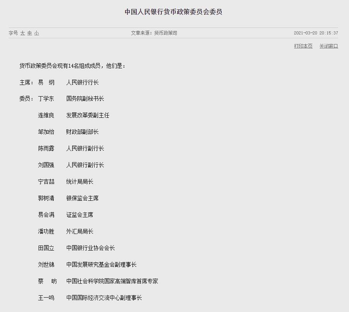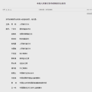 目前央行官网已经更新货币政策委员会委员名单。网站显示,央行货币政策委员会共有14位委员。其中,央行行长易纲担任货币政策委员会主席。