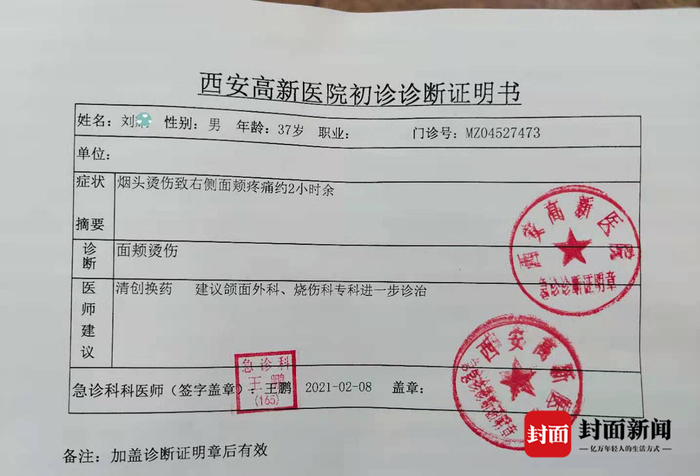 刘尧提供给封面新闻记者的西安高新医院的急诊病历显示,病人“烟头烫伤致右侧面颊疼痛2小时”,其提供的照片可以看出,其右侧脸颊可见两处不规则烫伤。刘尧表示,伤势已有所恢复,但仍有疤痕,医美人士称疤痕可以减淡但无法确保消失。