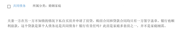 夫妻一方在另一方不知情的情况下私自买房并申请了房贷,购房合同和贷款合同均只有一方签字盖章,银行也顺利放款。我想知道这个贷款是算个人债务还是共同债务?银行有责任吗?此房是家庭多套房之一,并不是家庭刚需。