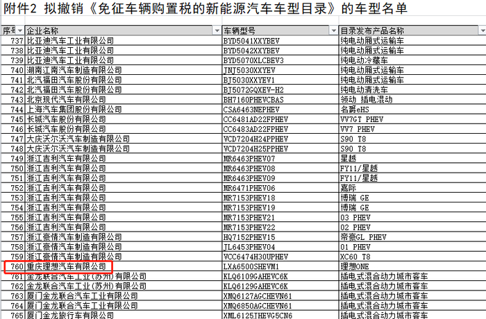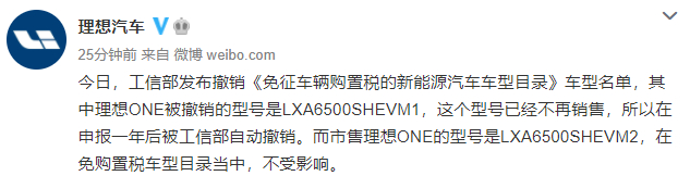工信部发布拟撤销免征购置税新能源车目录名单 理想汽车回应
