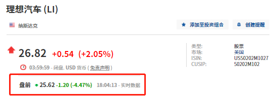 受此影响,理想汽车美股盘前跳水,一度跌超5%,截至发稿,跌超4%。