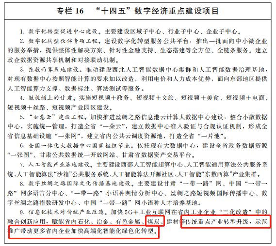 实施数字能源工程,推进大型煤电、风电场、光伏电站等建设智慧电厂,所有生产煤矿建成智能煤矿,