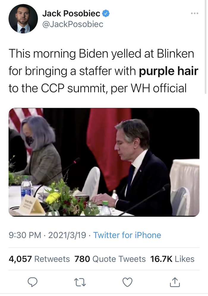 ▲中美高层战略对话中布林肯右手边的紫发翻译引发美国网友讨论。图据推特