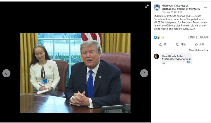 据新华社报道,2019年2月22日,时任美国总统特朗普在白宫椭圆形办公室会见正在美国进行第七轮中美经贸高级别磋商的中共中央政治局委员、国务院副总理、中美全面经济对话中方牵头人刘鹤。蒙特雷高级翻译学院社交媒体当时发布消息称,当时正是Lam作为“美国国务院口译员”,为特朗普做翻译。