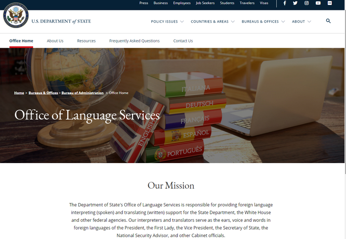 隶属于美国国务院的语言服务办公室(Office of Language Services)永久性直接雇佣职位非常少,只有约20名外交及会议口译,涉及十几种语言;还有12名笔译,涉及15种语言。而这个总计约35人的翻译团队,要为白宫和其他联邦机构服务,为总统及第一夫人、副总统、国务卿、国家安全顾问及其他内阁成员服务。因此,除了为数不多的永久雇员,该办公室长期外聘一千多名口译员和五百多名笔译员作为协助。