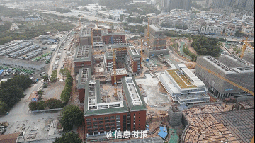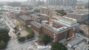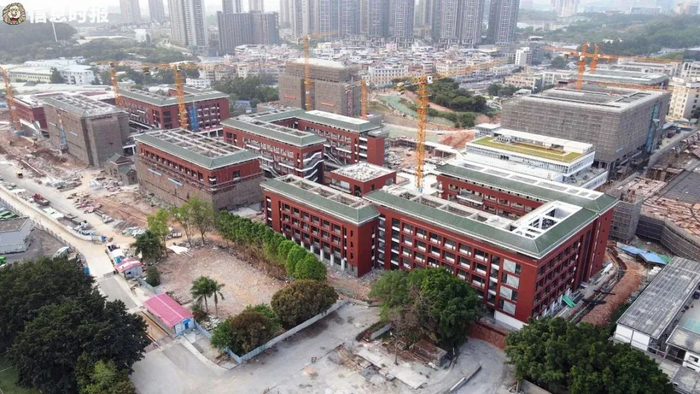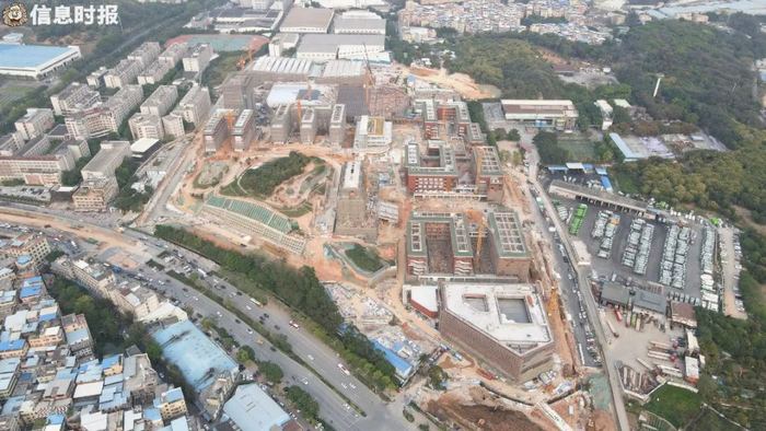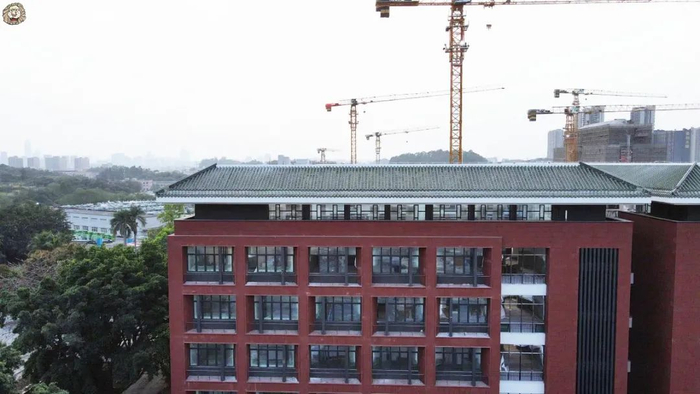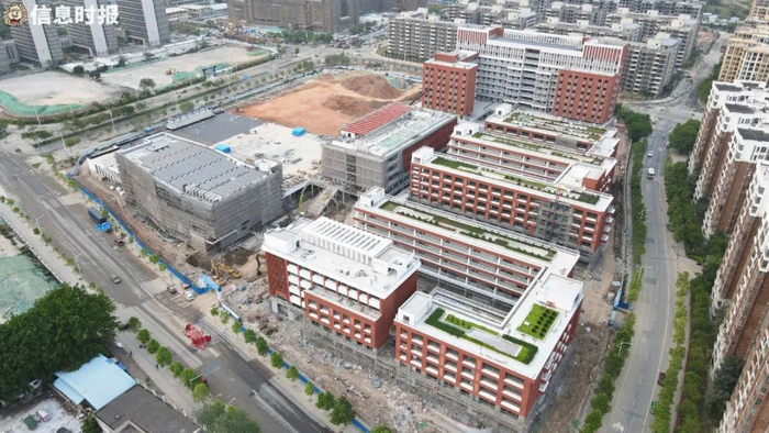 记者来到学校施工现场看到,目前靠近主校门的教学楼、宿舍楼的主体建筑已现雏形,整个建筑沿袭了“执信”红砖绿瓦的建筑风格;学生食堂则为白色建筑,屋顶平台种植着草皮;同时,学校图书馆、艺术中心、综合体育馆等建筑框架也已搭建完成,正在进行外立面的施工,体育场则还在建设中。