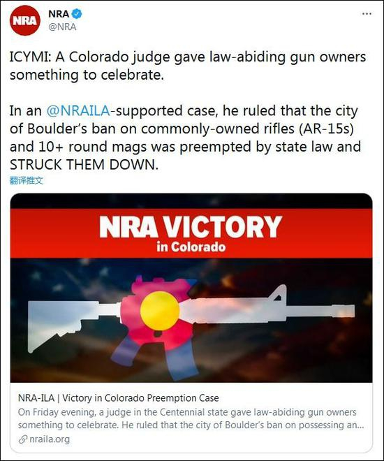 值得一提的是,美国步枪协会上周二还发推“庆祝”了博尔德法官的推翻裁决,称它在推翻禁令中起到了支持作用。