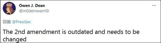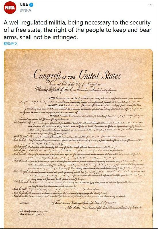 这条推特写道:“管制良好的民兵是保障自由国家安全所必需的,因此人民持有和携带武器的权利不得侵犯。”这句话,正是第二修正案的内容之一。
