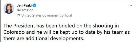 拜登方面还未正式回应,但白宫发言人普萨基在推特上表示,拜登已获知科罗拉多枪击案,他的团队也会随时向他汇报最新进展。