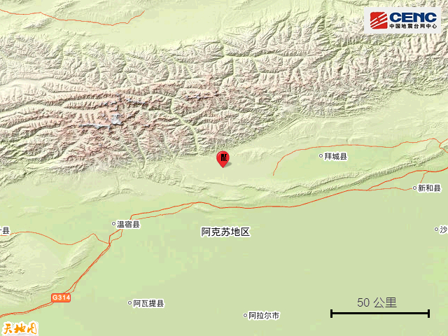 震中简介:拜城县隶属于新疆维吾尔自治区阿克苏地区,位于天山中段南麓、却勒塔格山北缘的山间盆地、渭干河上游流域,四周群山环抱,地形复杂。气候干燥,冬季寒冷、夏季凉爽,矿产资源储量丰富。该县总面积1.9万平方公里,下辖4镇10乡,2014年人口约25万,2014年该县GDP达49亿元。