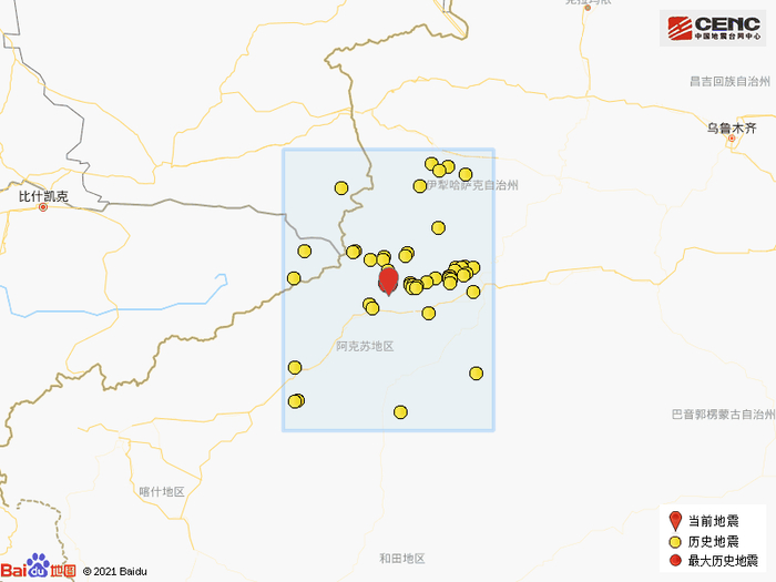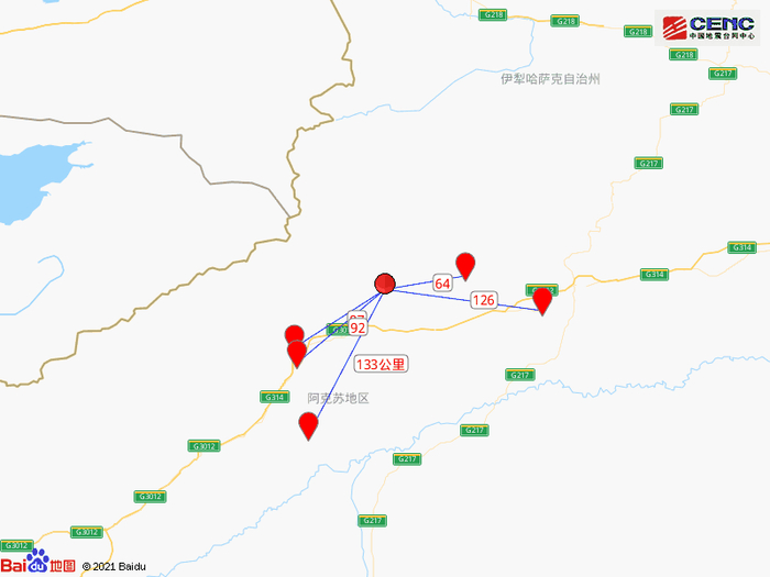 周边县城:震中距拜城县64公里、距温宿县87公里、距阿克苏市92公里、距新和县126公里、距阿瓦提县133公里,距阿克苏地区92公里,距乌鲁木齐市581公里。