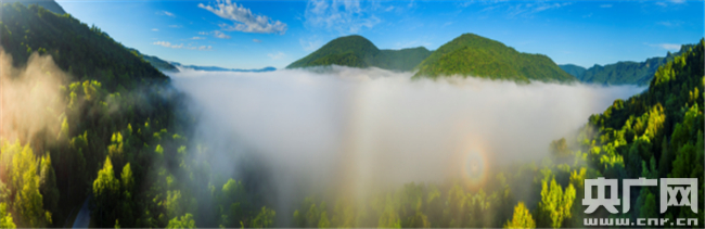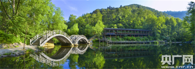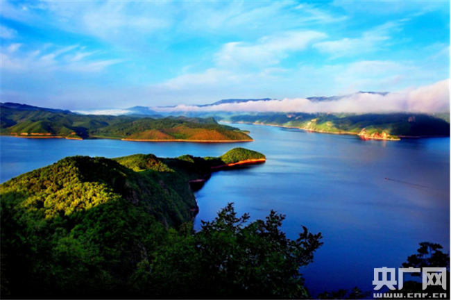 夏季的威虎山九寨绿树如玉,山风透过树荫,吹起一湖波澜,水汽在空中弥漫,风清水柔,舒展于云水之间。