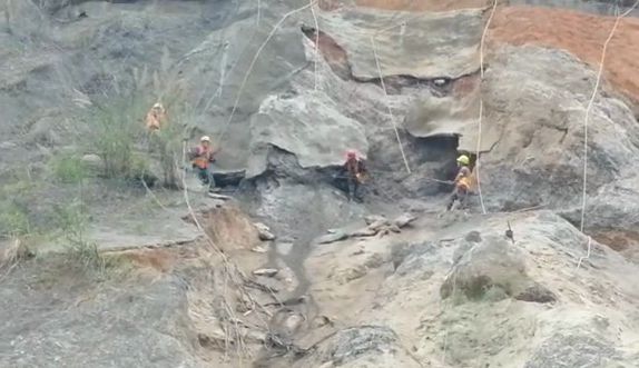 在取石之前,现场工作人员首先在巨石下方设置了围栏,防止巨石滚落到高速公路路中央,然后从边坡上系绳下降到巨石位置,用工具将周围泥土清空。