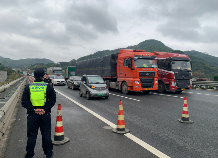 当天上午,二大队民警在隐患现场两端进行间歇性临时交通管制,在对巨石进行施工作业时,封闭梧柳路梧州往柳州方向的匝道,引导车辆往柳州方向车辆经官塘收费站绕行,避免作业中巨石及其他泥土石块滚落对过往车辆造成威胁。