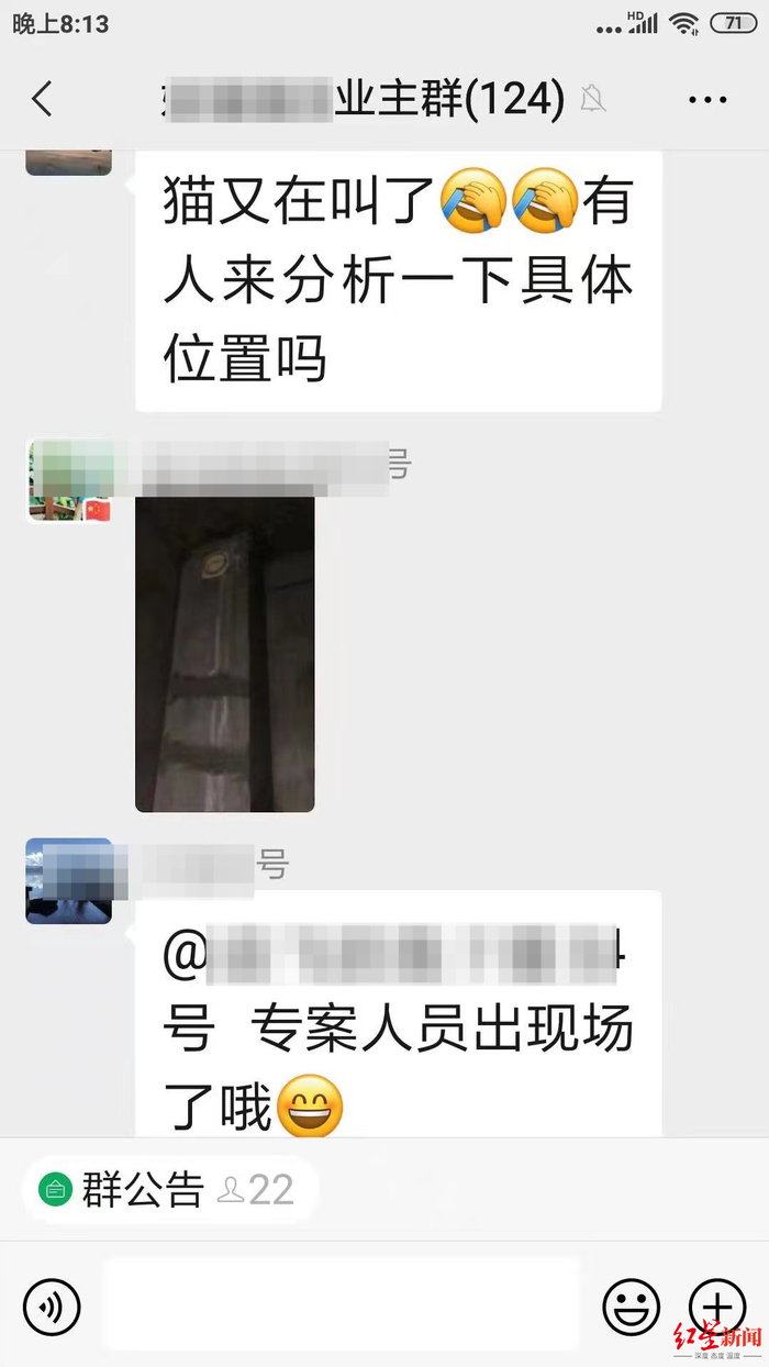 住在一楼的邻居杨先生告诉红星新闻记者,隐约听见猫叫声大约是在3月20日左右,开始以为是屋外有猫咪在活动,但连续两天,声音都是从一个地方传来,感觉不对劲。
