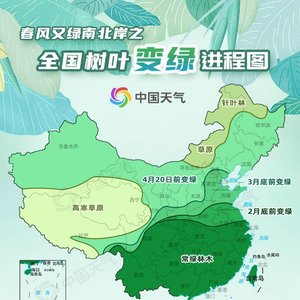 具体来看,预计3月底之前,甘肃东部、陕西中部、山西南部、河北大部平原地区的树叶都将变绿,迎来绿意盎然的春日。随着春风的脚步继续向北,4月20日之前,华北北部、内蒙古东南部、东北地区中南部以及西北地区大部的树叶也将变绿。