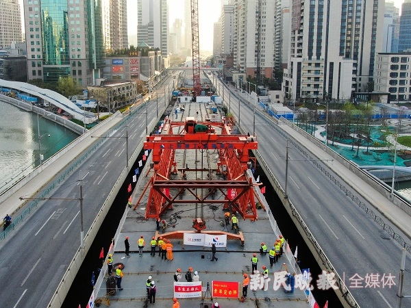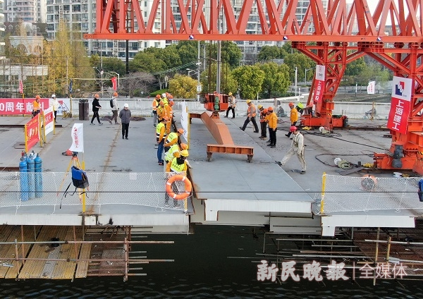 图说:长寿路中幅桥主桥结构合龙 新民晚报记者 陈梦泽 摄(下同)