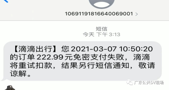 因滴滴App对完单3天后仍未支付的订单有支付提醒功能,系统自动发送了订单未完成支付的短信提醒。此时,平台已经主动拦截免密支付。
