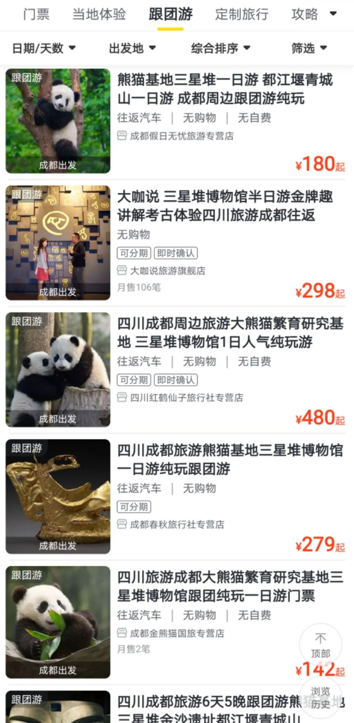 中新经纬查询第三方预订平台发现,多家旅行社还推出了各式各样的三星堆旅游组合产品。例如,携程平台上的成都任性旅行社推出了“四川广汉三星堆博物馆+3小时趣味精讲一日游”,售价298元,费用包含72元的博物馆门票及导游费、车费等,目前已月销200多份;飞猪平台上的成都华夏国旅金牛第二店推出了“三星堆+熊猫基地一日游”,售价258元,费用包括大熊猫繁育研究基地门票、午餐、三星堆艺术馆门票及导游讲解费、车费等;去哪儿平台上的四川省中国国际旅行社推出的“三星堆+熊猫基地+青城山都江堰2天1夜自由行”,售价1699元,费用包括景区门票、酒店住宿等。