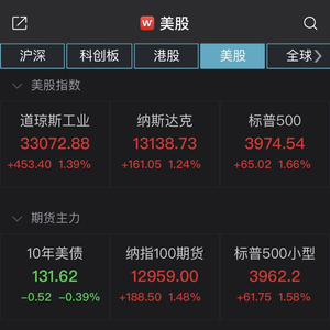截至收盘,道指涨453.40点,报33072.88点,涨幅为1.39%;纳指涨161.05点,报13138.73点,涨幅为1.24%;标普500指数涨65.02点,报3974.54点,涨幅为1.66%。