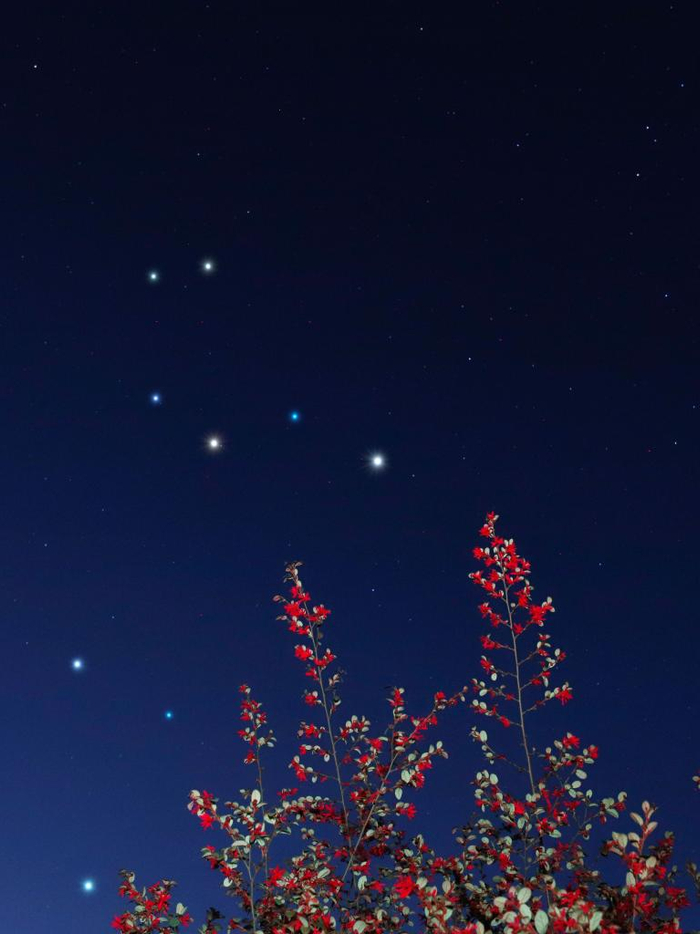 顺着斗柄的几颗星所形成的曲线延伸出去,是牧夫座的大角星,它是春夜星空的第一亮星,颜色黄里带红,非常醒目。牧夫座中另外五颗较暗的星,组成一个五边形,将它们与大角星用假想线连接起来,活像一只风筝,而大角星恰似挂在风筝下端的一盏明灯。