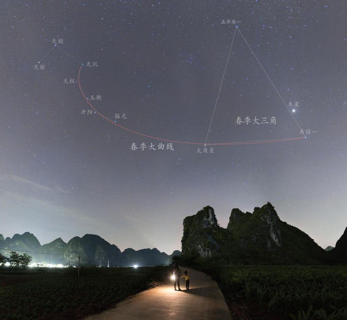 广西壮族自治区天文爱好者王晋2017年4月拍摄的“春季大曲线”和“春季大三角”照片。