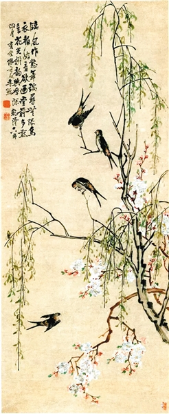 《桃花柳燕图》以写意的笔法画面上一株柳树从右下方横空出世,枝干劲健挺拔,其上垂下众多枝条,柳叶葱绿青翠,显示出勃勃生机。让人想起贺知章的“碧玉妆成一树高, 万条垂下绿丝绦”的诗句。柳树后面生发出几枝桃树,红花、白花竞相盛开,芬菲烂漫、妩媚鲜丽,淡绿的树叶映衬花间。桃树枝干以褐色设色,与墨色的柳树枝干相映成趣。桃柳之间,四只早春暖燕,或展翅飞翔,或静立树枝,或欲俯冲而下,或吱吱啾啾,神态各异,栩栩如生,活泼可爱。整个画面和谐明朗,笔墨工致,描绘了桃红柳绿、燕子嬉春之景象,生动地传递了春天的气息,暖意融融。“桃红柳绿簇春华,燕语莺啼尽日佳”。
