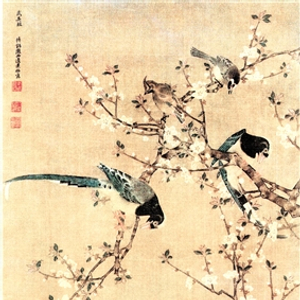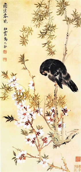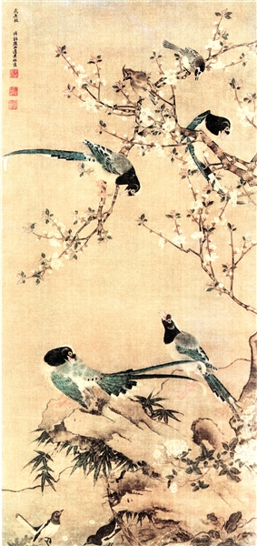 明代画家边景昭的《春禽花木图》(又称《花竹聚禽图》),绢本设色,纵137.7厘米,横65.5厘米,现藏于上海博物馆。