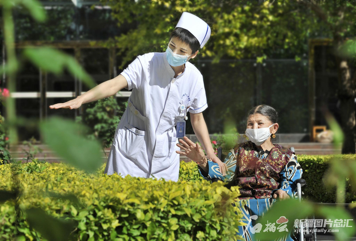 这是喀什地区第二人民医院呼吸科护士阿依加玛丽·买买提带患者到户外活动(2020年5月10日摄)。(摄影:约提克尔·尼加提)
