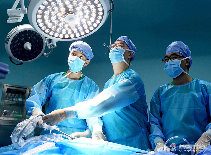 这是新疆医科大学第一附属医院胸外科医生宗亮(中)在喀什地区莎车县人民医院为患者进行手术(2020年6月18日摄)。(摄影:韩亮)