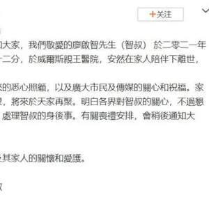 “现在以万般不捨的心情通知大家,我们敬爱的廖启智先生(智叔) 于二零二一年三月二十八日晚上八时三十二分,于威尔斯亲王医院,安然在家人陪伴下离世,回归天父怀中。