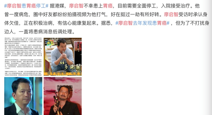 据媒体报道,廖启智是去年发现患上胃癌,他不想亲友担心,一直低调治疗,仅得少数好友知道此事。