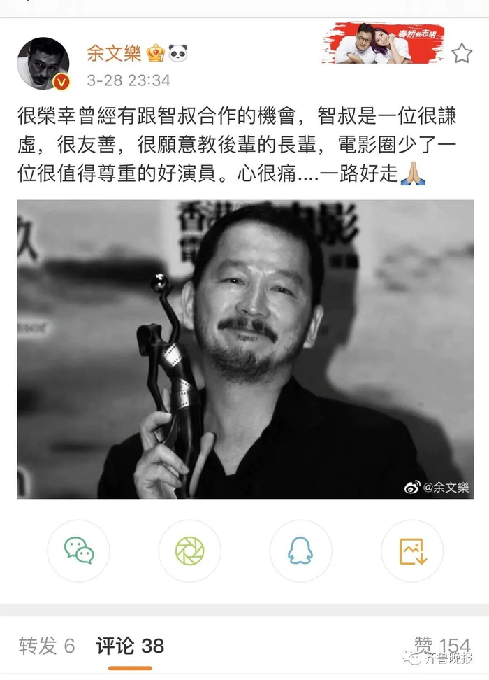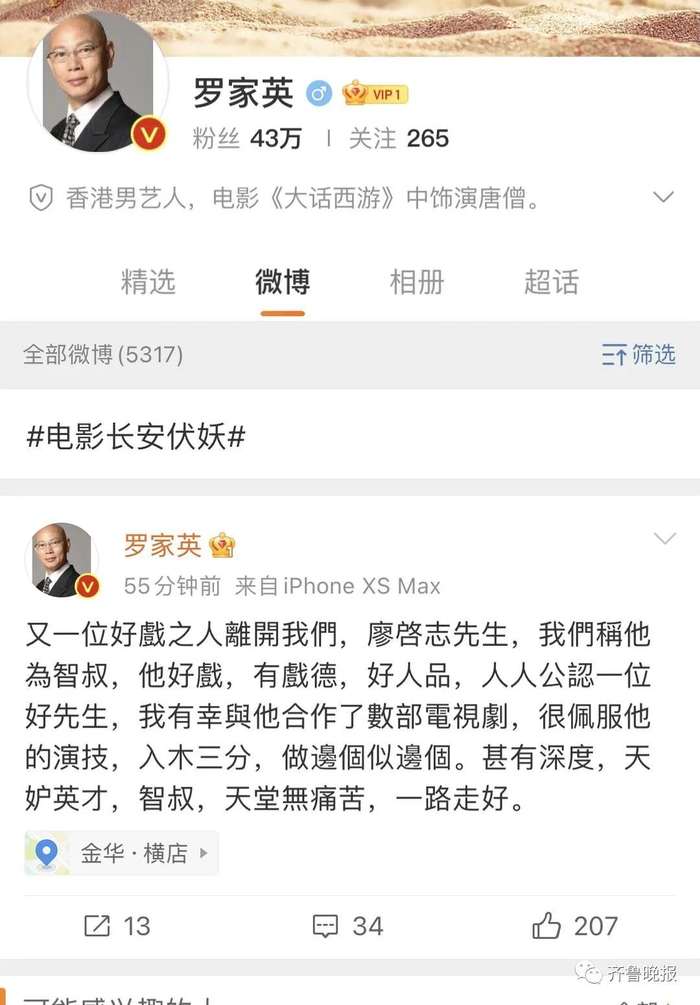 得知廖启智去世消息后,和“智叔”合作过的罗家英、余文乐等纷纷发文悼念。