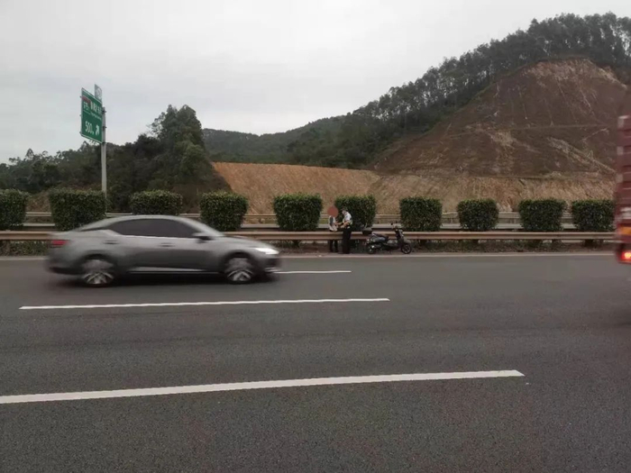 3月27日18时50分,广西壮族自治区公安厅交警总队高速公路管理支队七大队民警接到报警,称有一名男子骑着电动车跑在兰海高速钦州西服务区附近的公路上。接警后,执勤民警立即展开巡逻。