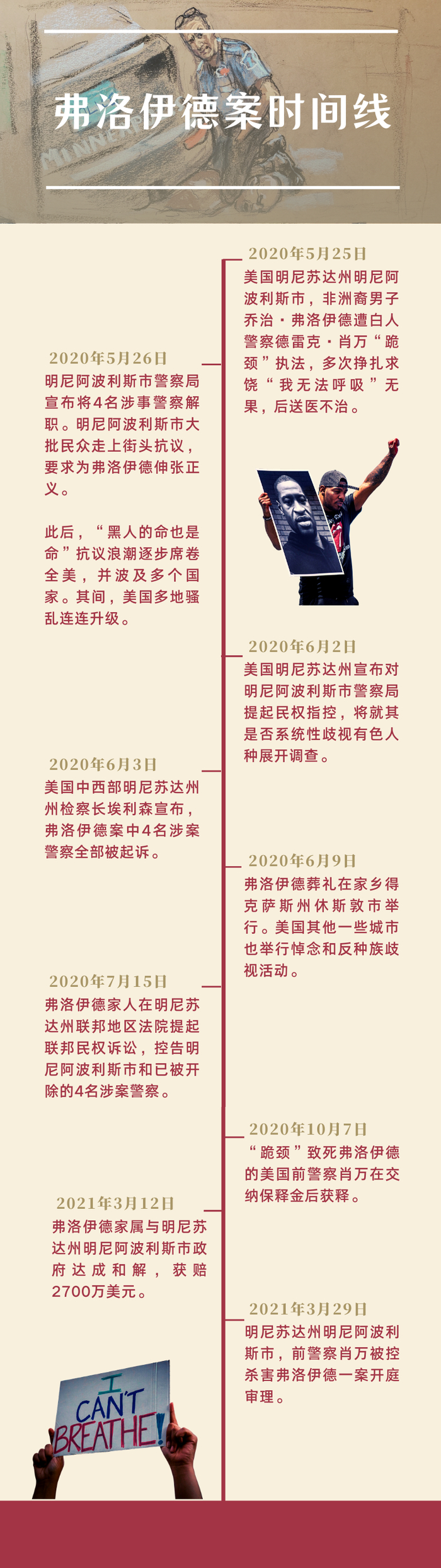 这是近年来美国最具关注度的人权重案。弗洛伊德之死去年以来在全美掀起多轮示威抗议活动。谁来为弗洛伊德之死担责?此案能否治疗美国种族主义痼疾?请看新华社记者的报道——
