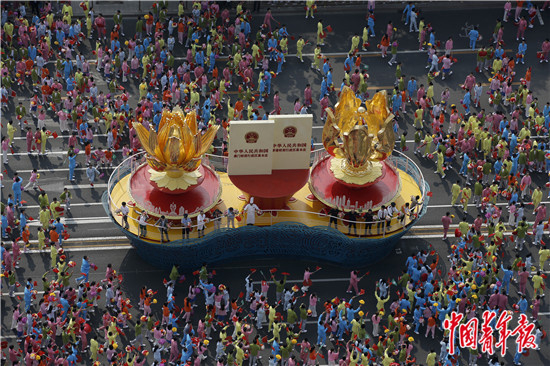 2019年10月1日,北京,庆祝中华人民共和国成立70周年大会上,“一国两制”方阵彩车在行进中。中青报·中青网记者 李峥苨/摄