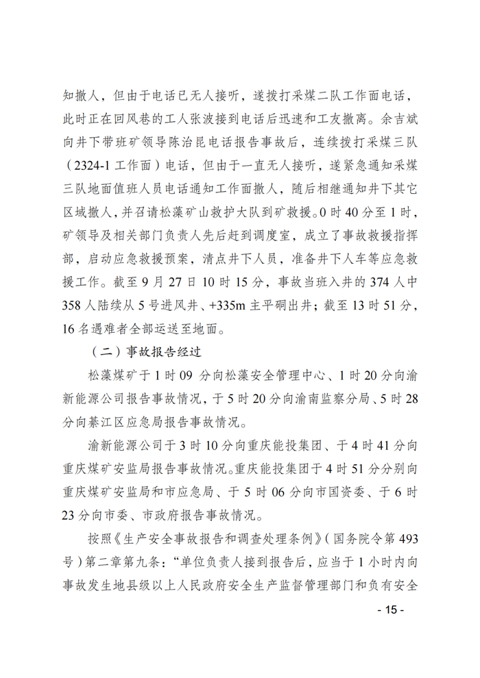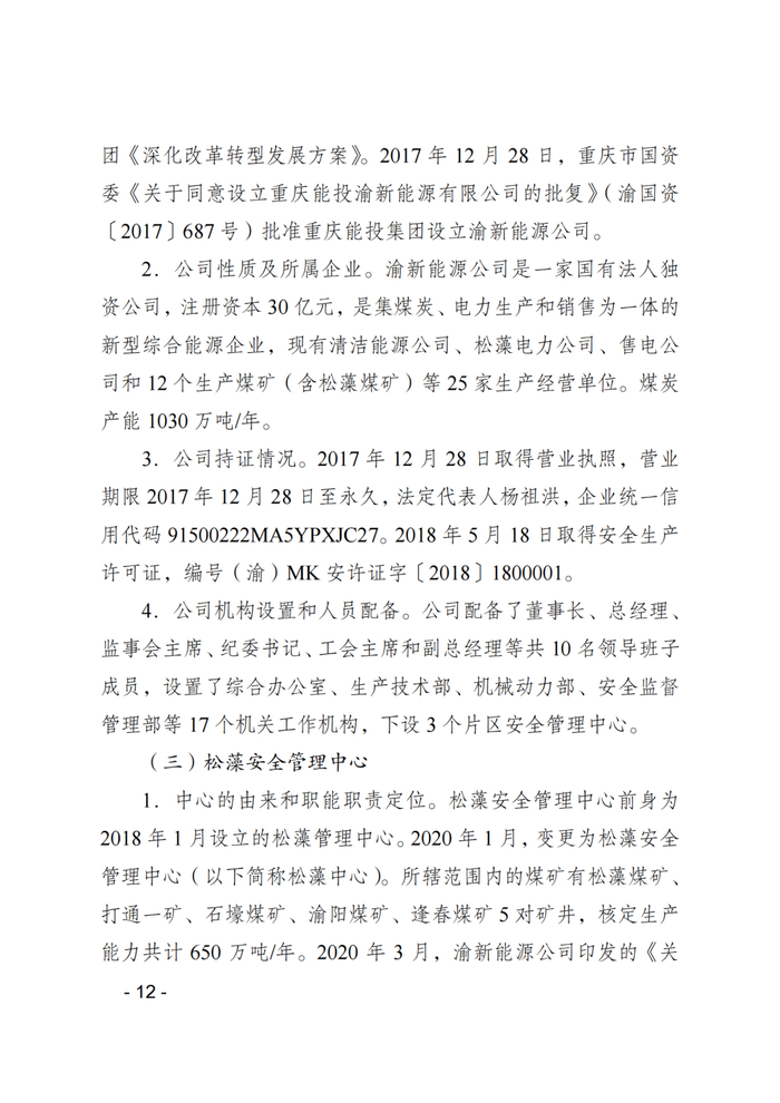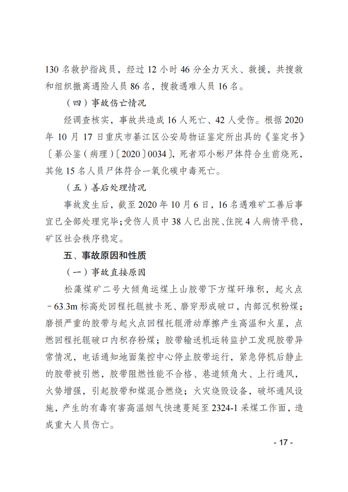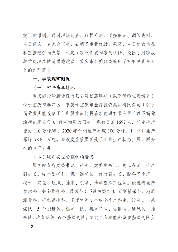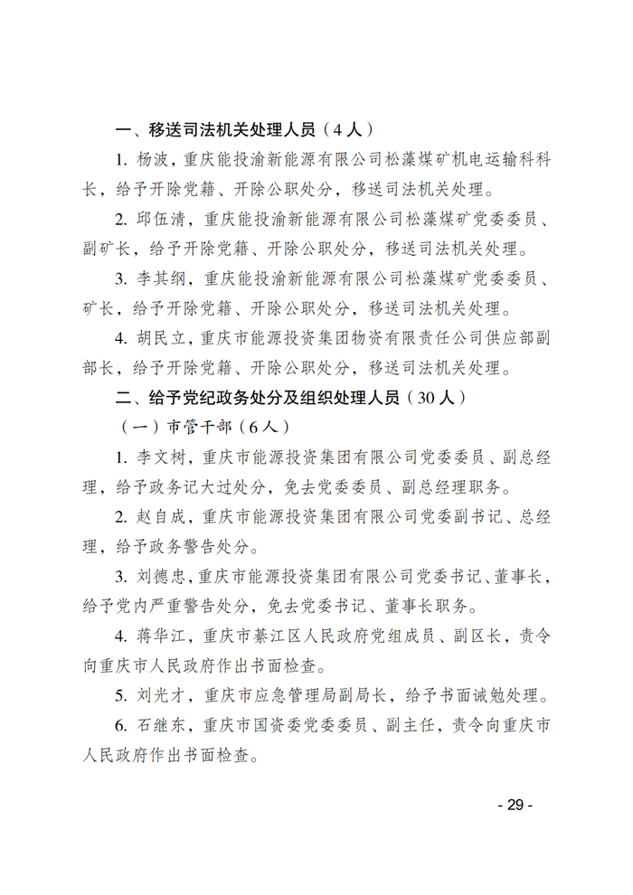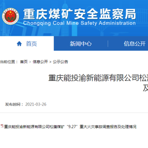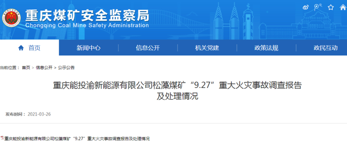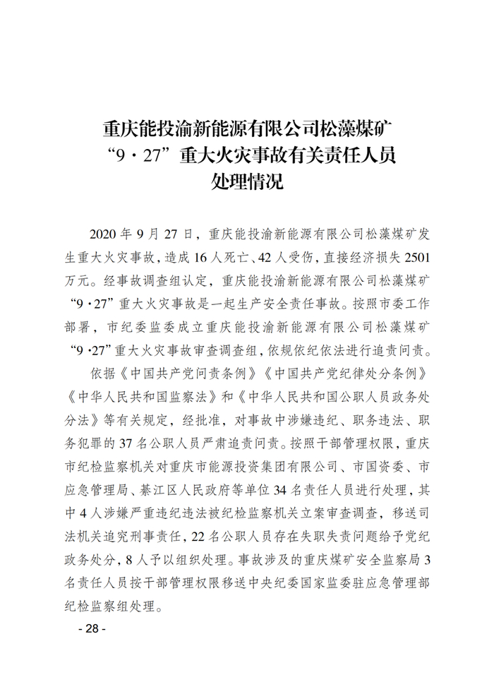 3月26日,重庆煤矿安全监察局网站公布的《重庆能投渝新能源有限公司松藻煤矿“9·27”重大火灾事故调查报告及处理情况》显示,依据《中国共产党问责条例》《中国共产党纪律处分条例》《中华人民共和国监察法》和《中华人民共和国公职人员政务处分法》等有关规定,经批准,对事故中涉嫌违纪、职务违法、职务犯罪的37名公职人员严肃追责问责。