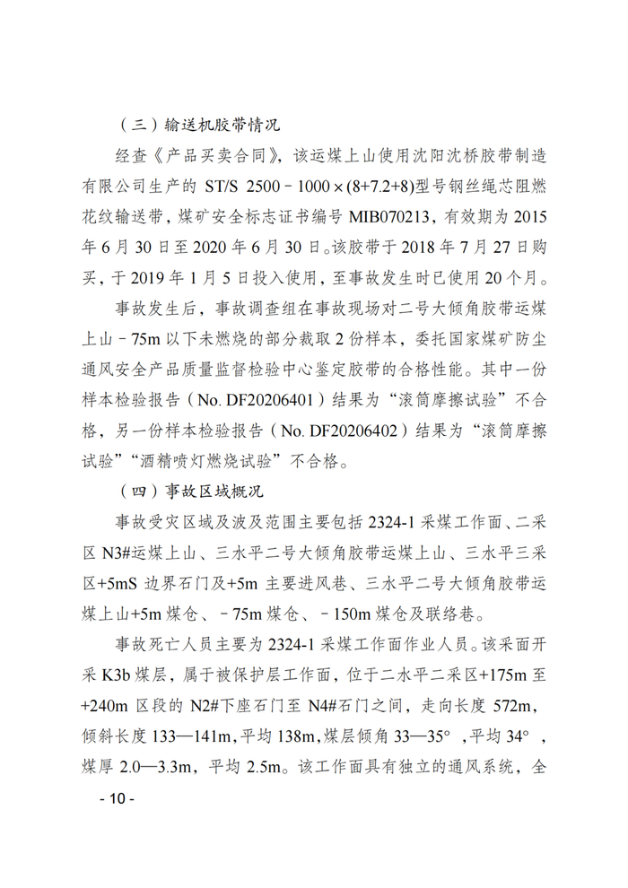 6.带式输送机使用的胶带质量不合格。经对事故地点的胶带取样送检和对胶带采购环节专项调查,该胶带为假冒伪劣产品;重庆能投集团物资有限责任公司存在物资采购制度不健全、采购询价和交货验收违规等问题。