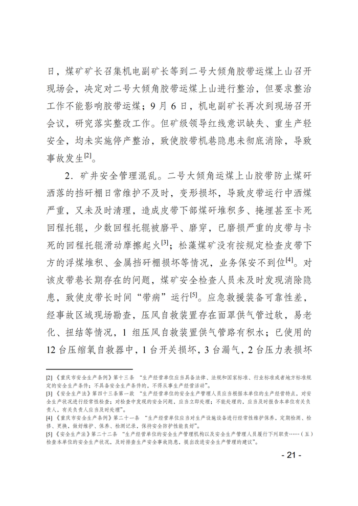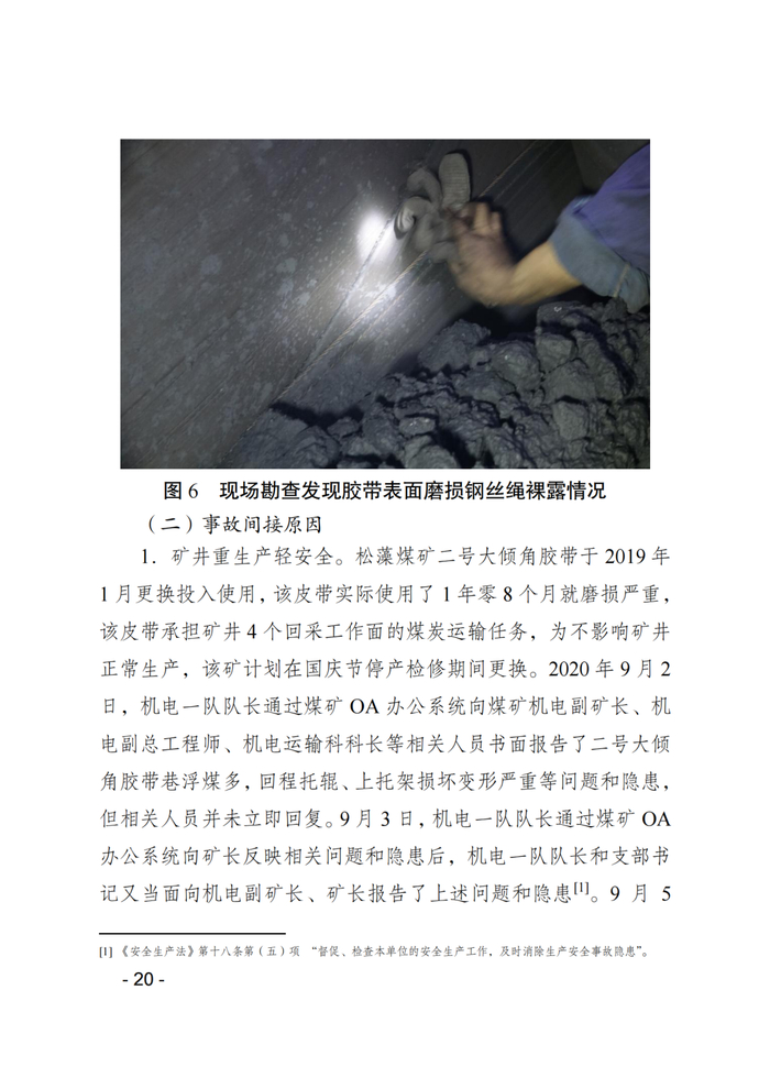 1.矿井重生产轻安全。松藻煤矿二号大倾角胶带于2019年1月更换投入使用,该皮带实际使用了1年零8个月就磨损严重,该皮带承担矿井4个回采工作面的煤炭运输任务,为不影响矿井正常生产,该矿计划在国庆节停产检修期间更换。2020年9月2日,机电一队队长通过煤矿OA办公系统向煤矿机电副矿长、机电副总工程师、机电运输科科长等相关人员书面报告了二号大倾角胶带巷浮煤多,回程托辊、上托架损坏变形严重等问题和隐患,但相关人员并未立即回复。9月3日,机电一队队长通过煤矿OA办公系统向矿长反映相关问题和隐患后,机电一队队长和支部书记又当面向机电副矿长、矿长报告了上述问题和隐患。9月5日,煤矿矿长召集机电副矿长等到二号大倾角胶带运煤上山召开现场会,决定对二号大倾角胶带运煤上山进行整治,但要求整治工作不能影响胶带运煤;9月6日,机电副矿长再次到现场召开会议,研究落实整改工作。但矿级领导红线意识缺失、重生产轻安全,均未实施停产整治,致使胶带机巷隐患未彻底消除,导致事故发生。