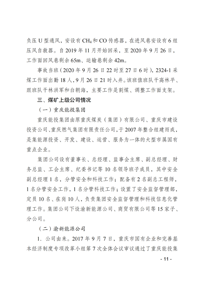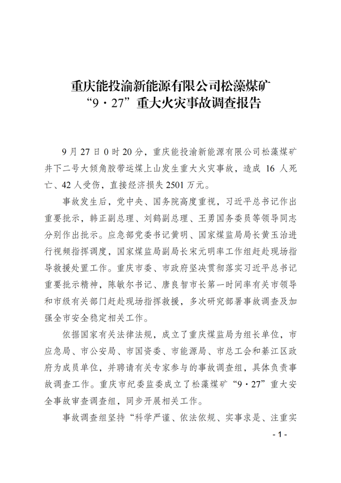 2020年9月27日,重庆能投渝新能源有限公司松藻煤矿发生重大火灾事故,造成16人死亡、42人受伤,直接经济损失2501万元。