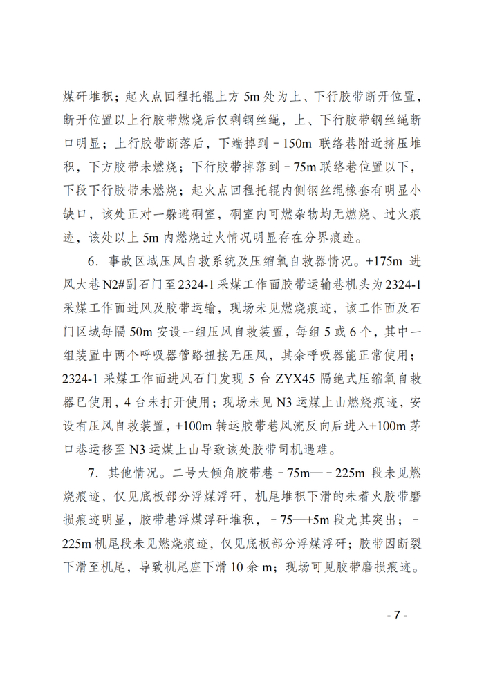 2.矿井安全管理混乱。二号大倾角运煤上山胶带防止煤矸洒落的挡矸棚日常维护不及时,变形损坏,导致皮带运行中洒煤严重,又未及时清理,造成皮带下部煤矸堆积多、掩埋甚至卡死回程托辊,少数回程托辊被磨平、磨穿,已磨损严重的皮带与卡死的回程托辊滑动摩擦起火;松藻煤矿没有按规定检查皮带下方的浮煤堆积、金属挡矸棚损坏等情况,业务保安不到位。对该皮带巷长期存在的问题,煤矿安全检查人员未及时发现消除隐患,致使皮带长时间“带病”运行。应急救援装备可靠性差,经事故区域现场勘查,压风自救装置存在面罩供气管过软,易老化、扭结等情况,1组压风自救装置供气管路有积水;已使用的12台压缩氧自救器中,1台开关损坏,3台漏气,2台压力表损坏。
