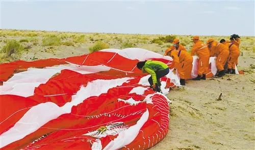 2020年5月8日,我国新一代载人飞船试验船返回舱在预定区域成功着陆,试验取得圆满成功。图为工作人员在回收试验船返回舱主伞。汪江波摄(新华社发)