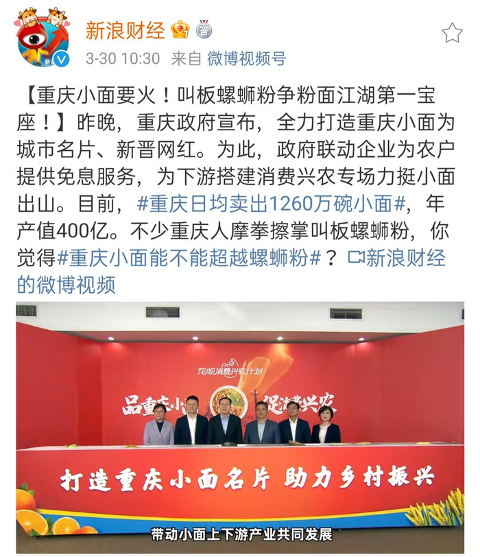 3月29日,在重庆举办的“品重庆小面 促消费兴农”的主题活动上,当地政府称将全力打造以“重庆小面”为IP的地域特色名片,让有着400年历史的重庆小面走出山城。