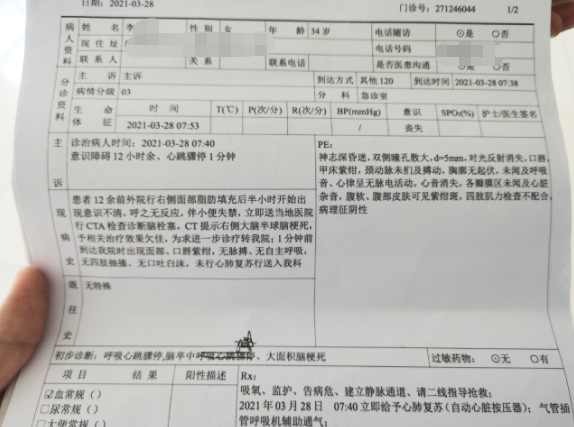 28日早晨7时38分,救护车将李女士送达省人民医院。李某某说,到了省人民医院不久,医生就下了病危通知书。省人民医院的急诊病历显示,李女士意识障碍12小时余、心跳骤停1分钟。病历上“现病史”一栏写着:患者12小时前外院行右侧面部脂肪填充后半小时开始出现意识不清,呼之无反应,伴小便失禁,立即送当地医院行CTA检查诊断脑栓塞,CT提示右侧大脑半球脑梗死, 予相关治疗效果欠佳,为求进一步诊疗转我院;初步诊断:呼吸心跳骤停,脑卒中呼吸心跳集育、大面积脑梗死。