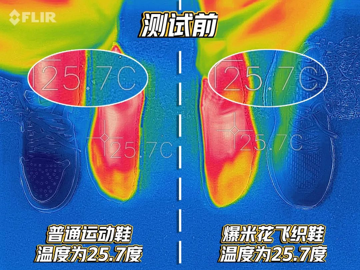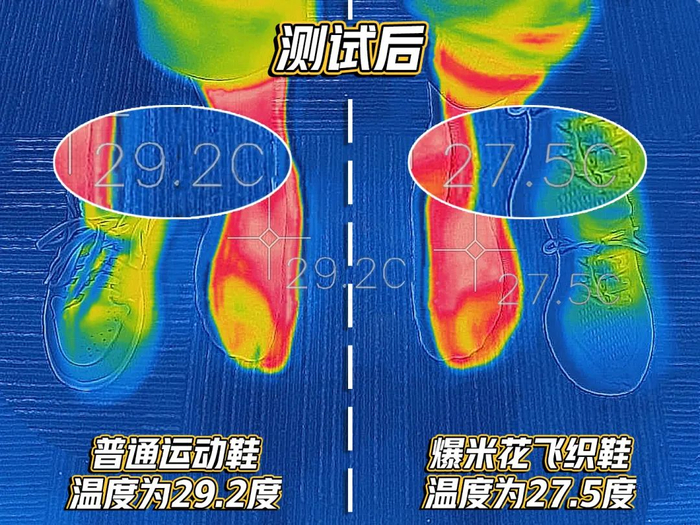 穿米斯特因爆米花飞织鞋的那只脚,温度足足低了2度,能「透风」就是不一样嗷!